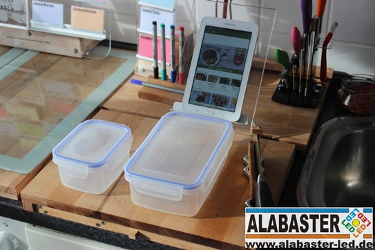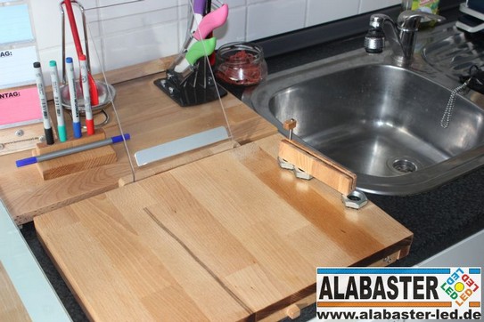 Das Brett sollte auch einen Halter für ein Tablet bekommen, auf dem man sich evtl. Re-