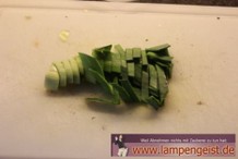 Jetzt schneidet zuerst den Lauch in Ringe und gebt ihn gleich in die Suppe,
